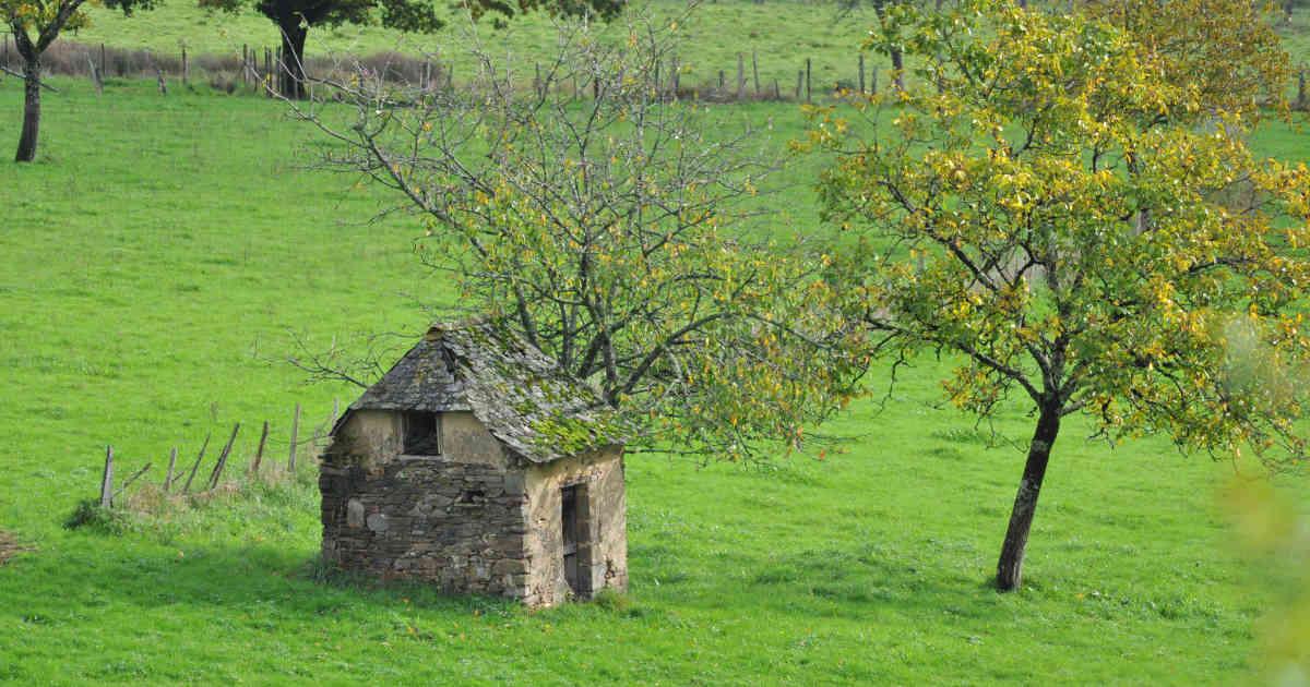 Une construction en pierre, patrimoine rural, au milieu d'une prairie verdoyante du côté d'Allassac.