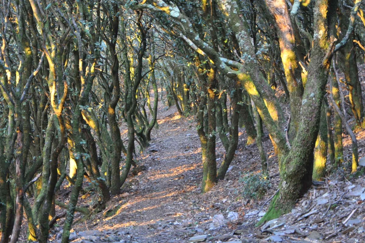 Chemin sous un couvert de chênes verts qui mène du village de Roquefère à la cascade de Cubserviès.