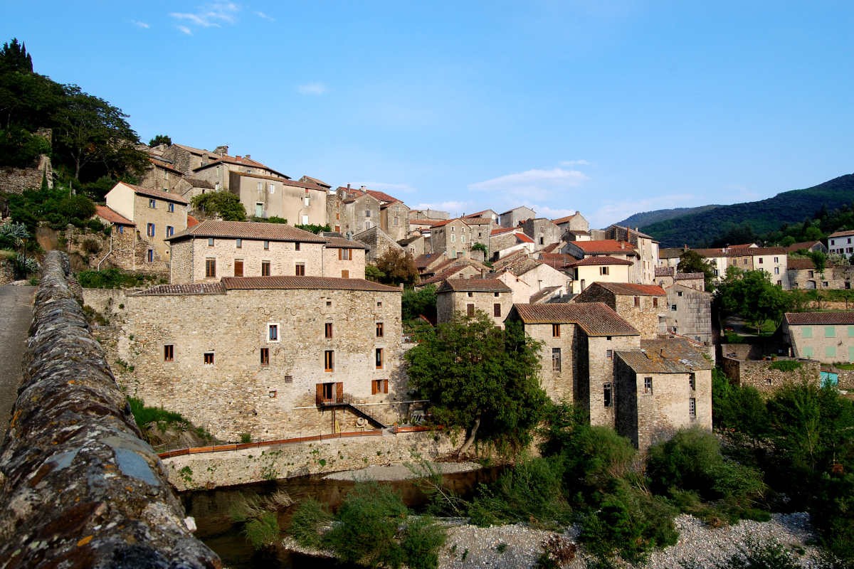 Prise de vue depuis le pont du diable sur les maisons anciennes et les rues tortueuses du village d'Olargues.