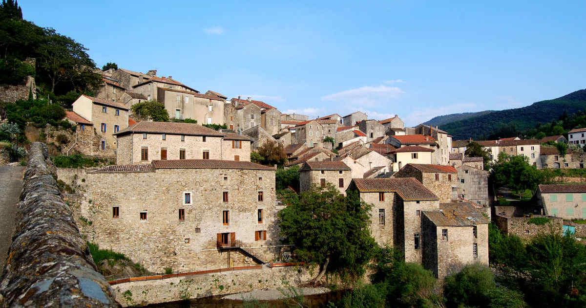 Prise de vue depuis le pont du diable sur les maisons anciennes et les rues tortueuses du village d'Olargues.