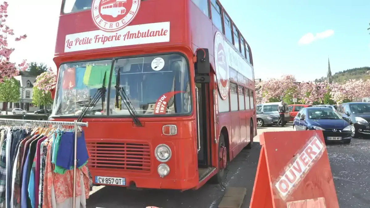 Une activité ambulante de commerce très originale découverte à Châteaulin, dans le Finistère, consistant à vendre des fripes dans un bus anglais à l'impériale.