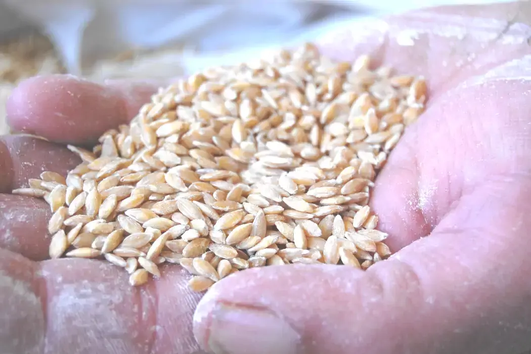 Poignée de grains de petit-épeautre biologiques produits par Patrick