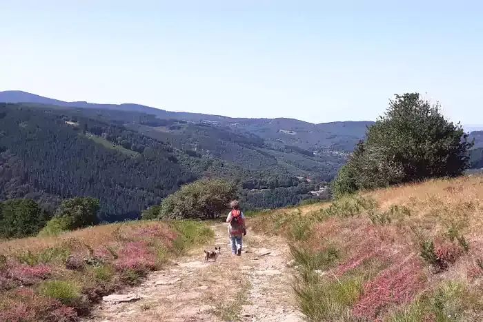 Randonneuse sur un chemin bordé de bruyère en fleurs à Roquerlan