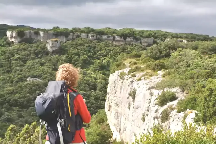 Vous marchez dans un paysage de garrigues, le minéral est très présent avec les parois de roche claire des gorges que vous longez, sitôt passé quelques petites parcelles de vignes, le chemin arrive sur un plateau offrant une belle vue tout autour de vous.