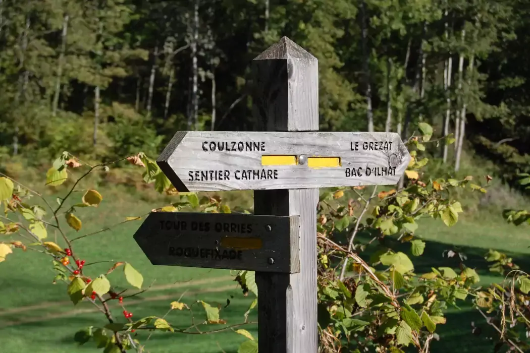 Panneaux de balisage en bois du tour des Orries à Roquefixade