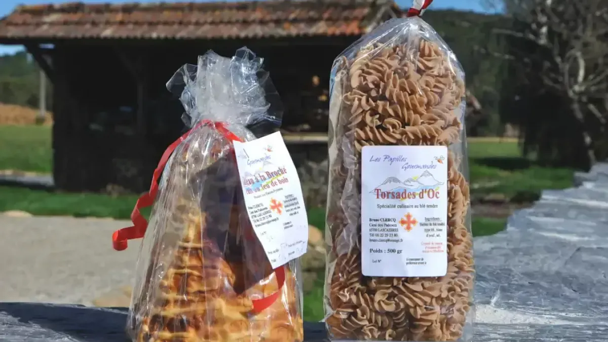 Nous allons à Lascazères, en Hautes-Pyrénées, rencontrer Bruno, producteur de pâtes au blé tendre, qui fait un délicieux gâteau à la broche cuit au feu de bois.