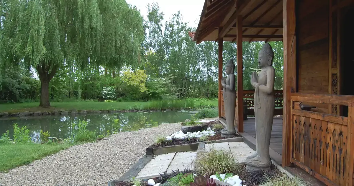 Sur les 7,5 ha de jardins aménagés, vous traverserez des petits ponts de bois enjambant des plans d’eaux couverts de nénuphars et bordés d’iris multicolores. Vous serpenterez à travers des allées ombragées et fleuries vous guidant vers des temples en bois ouvragé, gardés par de belles statues de pierre. A chaque détour, vous irez d’émerveillement en découverte, le tout accompagné par les pépiements des nombreux oiseaux et les frôlements d’insectes ravis de voir que de tels paradis existent encore par ici.
