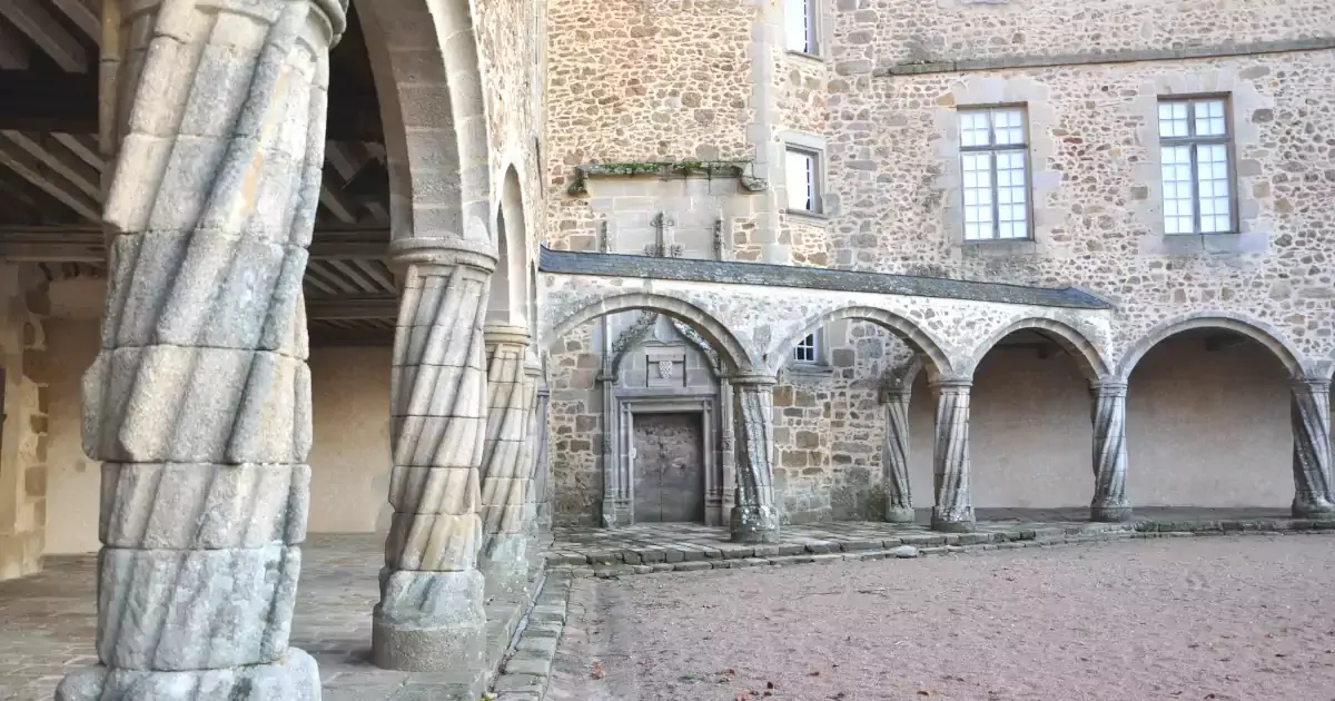 La plus grande partie du château date du XVème S. et la plus ancienne du XIIIème S. : c’est un vrai château fort avec un beau pont-levis, d’énormes tours d’angles et des mâchicoulis abritant une cour intérieure encadrée d’une galerie aux belles colonnes torsadées de style Renaissance.