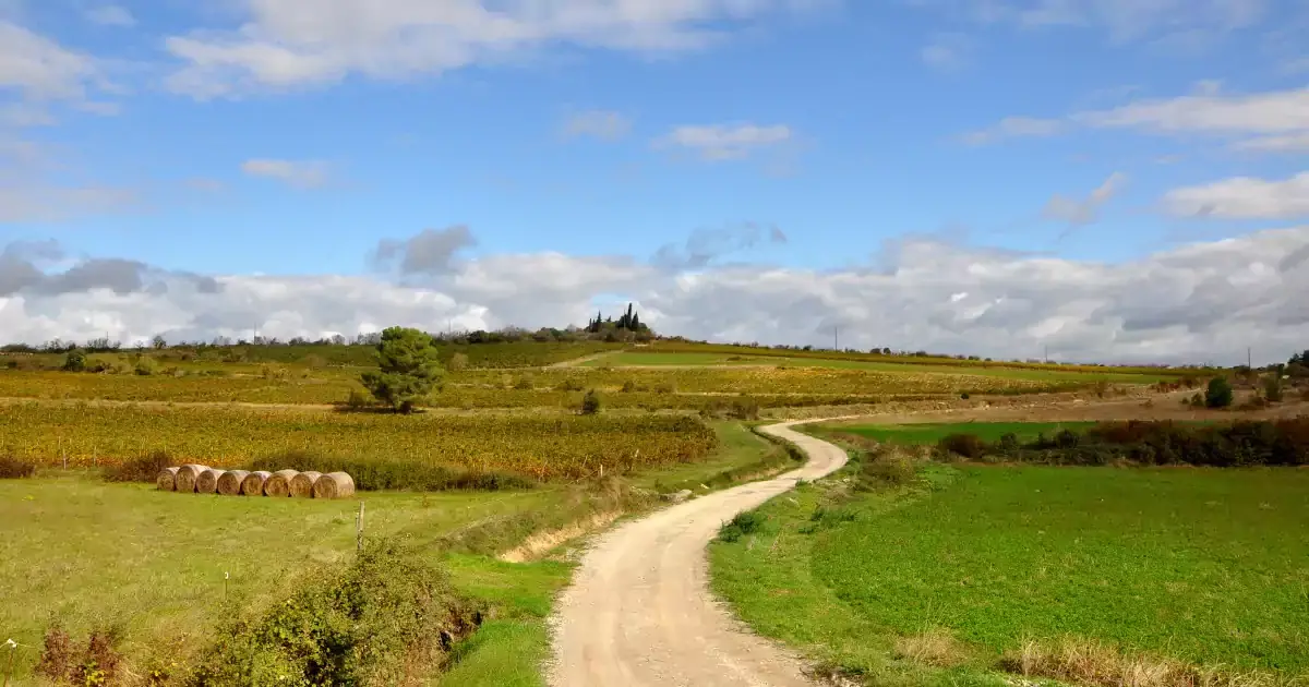 Large chemin entre vignes et prairies à Lavalette